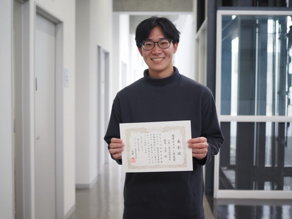 飯島くん(B4)が優秀ポスター発表賞を受賞 2025 11/07 研究成果 2025年11月7日 2025年11月6日に開催された材料科学総合学科 卒業論文 中間発表会にて、飯島くん(B4)が優秀ポスター発表賞を受賞しました。 発表題目「界面摩擦による局所欠陥加熱を利用したVibro 超音波フェーズドアレイによるき裂の選択的イメージング」 研究成果 Invited seminar by Prof. Guy Feuillard (INSA Centre Val de Loire, France) USE2025にて長久保准教授が基調講演 関連記事 Sixth Joint Meeting of ASA & ASJにてセッションオーガナイザー・招待講演(×2) 2025年11月22日 USE2025にて長久保准教授が基調講演 2025年11月14日 小原教授がAcademia NDT InternationalのCouncil Memberに就任 2025年9月9日 長久保先生にIEEE JAPAN MEDALが授与されました 2025年3月24日 川口くん(M1)、佐藤くん(M1)が日本非破壊検査協会 第32回超音波による非破壊評価シンポジウムにてポスター賞を受賞 2025年1月23日 芳川くん(M2)が日本非破壊検査協会 秋季講演大会にて新進賞を受賞 2024年12月4日 芳川くん(M2)がSymposium on Ultrasonic ElectronicsにてYoung Scientist Awardを受賞 2024年11月28日 郭くん(B4)が優秀ポスター発表賞を受賞 2024年11月8日