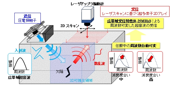• 構造物内部の欠陥を非破壊で評価する技術は、老朽化が進むインフラの維持管理に不可欠です。内部欠陥の検査には超音波が広く用いられ、近年は医療分野で開発された超音波フェーズドアレイ(注3)の工業利用も進んでいます。しかし、コンクリートは超音波の減衰が極めて大きく、既存の超音波フェーズドアレイ装置では内部を計測できないという課題がありました。東北大学大学院工学研究科の小原良和教授、藤川裕翔大学院生らの研究グループは、米国ロスアラモス国立研究所との国際共同研究により、これまで開発してきた圧電探触子送信(注4)とレーザ受信による超多素子2次元マトリクスアレイ(注5)を組み合わせたPLUSを発展させ、検査対象に応じて最適周波数を自動で選択する広帯域送受信システムを融合した「周波数自動可変型PLUS」を開発しました。その結果、多様なコンクリート内部の欠陥を3次元で可視化することに成功しました(図1)。本成果は、老朽化コンクリートインフラの危険箇所の特定に大きく貢献する技術です。本研究成果は1月27日(米国時間)に、応用物理学分野の学術誌Applied Physics Lettersに掲載されました。また、Featured Articleに選ばれました。