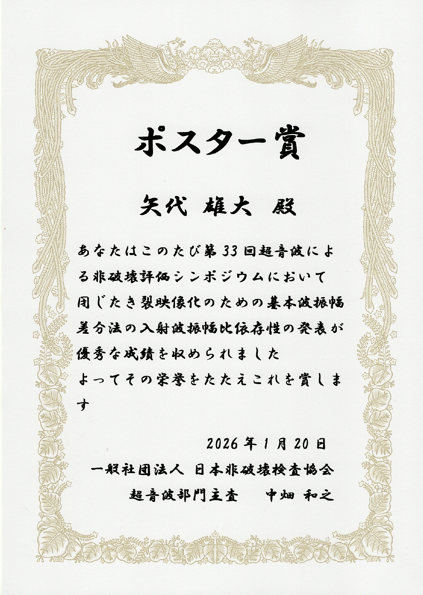藤川裕翔、T. J. Ulirch, M. C. Remillieux, 小原良和(新進賞受賞) “高減衰材検査のための低周波3D超音波フェーズドアレイ映像法PLUSの高速化に向けた基礎検討” 日本非破壊検査協会 第31回超音波による非破壊評価シンポジウム@東京都立産業技術研究センター 青海本部